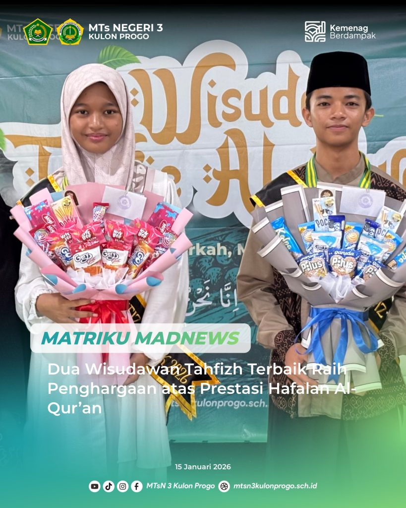 Kulon Progo (MTsN3KP) — MTsN 3 Kulon Progo melaksanakan pemberian apresiasi kepada wisudawan terbaik tahfizh pada Kamis (15/01/2026). Kegiatan ini berlangsung di Mushola Baiturrahman MTsN3KP sebagai bentuk penghargaan atas capaian hafalan Al-Qur’an. Pemberian penghargaan dilakukan oleh Agus Ali Rahmad yang hadir langsung untuk menyerahkan apresiasi kepada wisudawan terbaik. Kegiatan ini disaksikan oleh warga madrasah dengan… Baca Selengkapnya: Dua Wisudawan Tahfizh Terbaik Raih Penghargaan atas Prestasi Hafalan Al-Qur’an