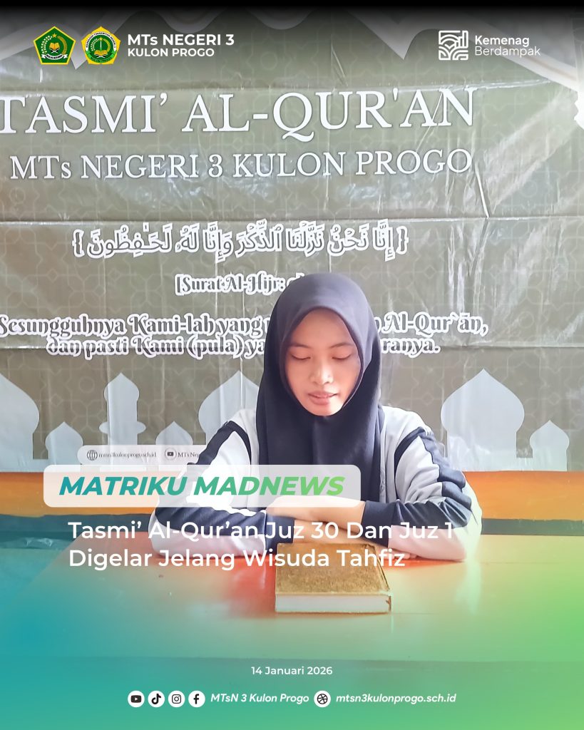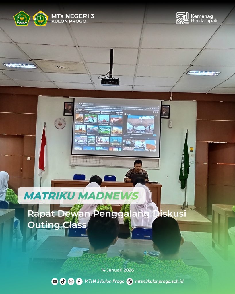 Kulon Progo (MTsN3KP) – MTsN 3 Kulon Progo melaksanakan kegiatan tasmi’ Al-Qur’an Juz 30 dan Juz 1 pada Rabu (14/01/2026) bertempat di mushola madrasah. Kegiatan ini diikuti oleh tiga peserta didik, yakni Aulia Restu, Ataya Rahmah, dan Nafsizzakiyah, sebagai bagian dari rangkaian persiapan wisuda tahfiz. Pelaksanaan tasmi’ dipandu oleh Koordinator Program Tahfiz, Sigit Adi Pratomo,… Baca Selengkapnya: Tasmi’ Al-Qur’an Juz 30 Dan Juz 1 Digelar Jelang Wisuda Tahfiz - Rapat Dewan Penggalang Diskusi Outing Class