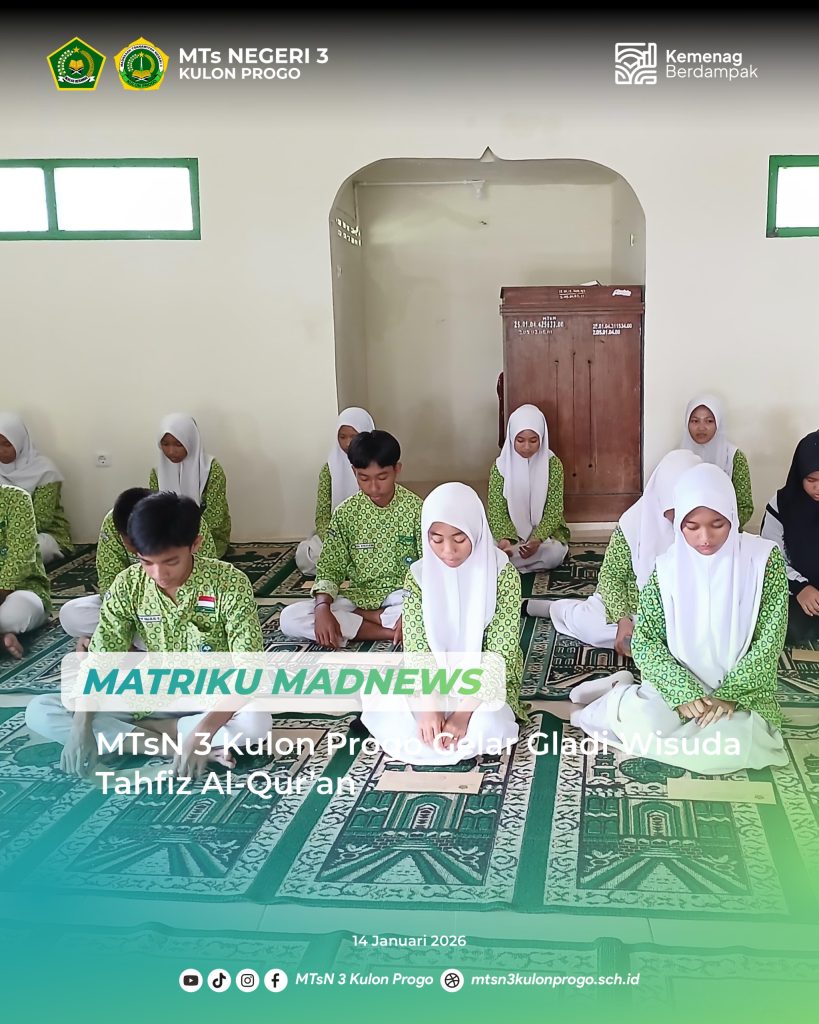 Kulon Progo (MTsN3KP) – MTsN 3 Kulon Progo melaksanakan gladi wisuda tahfiz Al-Qur’an pada Rabu (14/01/2026) yang diikuti oleh 17 peserta didik kelas 9. Kegiatan ini dilaksanakan di mushola madrasah sebagai bagian dari persiapan menjelang pelaksanaan wisuda tahfiz. Gladi wisuda dipandu oleh Koordinator Program Tahfiz, Sigit Adi Pratomo, untuk memastikan seluruh rangkaian acara berjalan tertib… Baca Selengkapnya: MTsN 3 Kulon Progo Gelar Gladi Wisuda Tahfiz Al-Qur’an - Tasmi’ Al-Qur’an Juz 30 Dan Juz 1 Digelar Jelang Wisuda Tahfiz