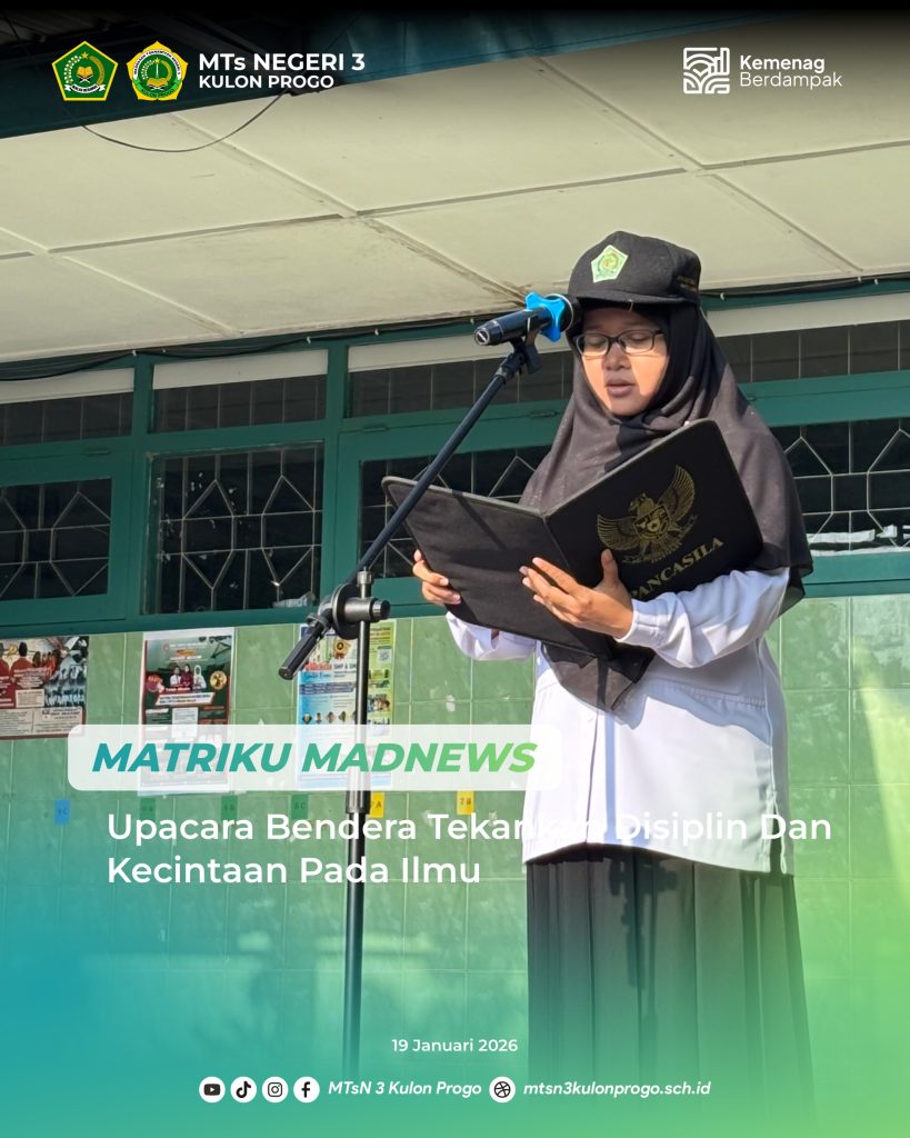 Kulon Progo (MTsN3KP) – MTsN 3 Kulon Progo melaksanakan upacara bendera di halaman madrasah yang diikuti oleh peserta didik serta guru dan tenaga kependidikan (GTK). Kegiatan tersebut dilaksanakan pada Senin (19/01/2026) sebagai bagian dari pembinaan karakter dan kedisiplinan warga madrasah. Bertindak sebagai pembina upacara, Rr. Siti Murdaning menyampaikan amanat kepada seluruh peserta upacara. Dalam amanatnya,… Baca Selengkapnya: Upacara Bendera Tekankan Disiplin Dan Kecintaan Pada Ilmu - Petugas Kelas VIII C Sukses Laksanakan Upacara Bendera Hari Senin
