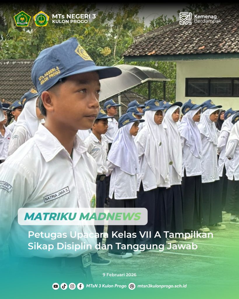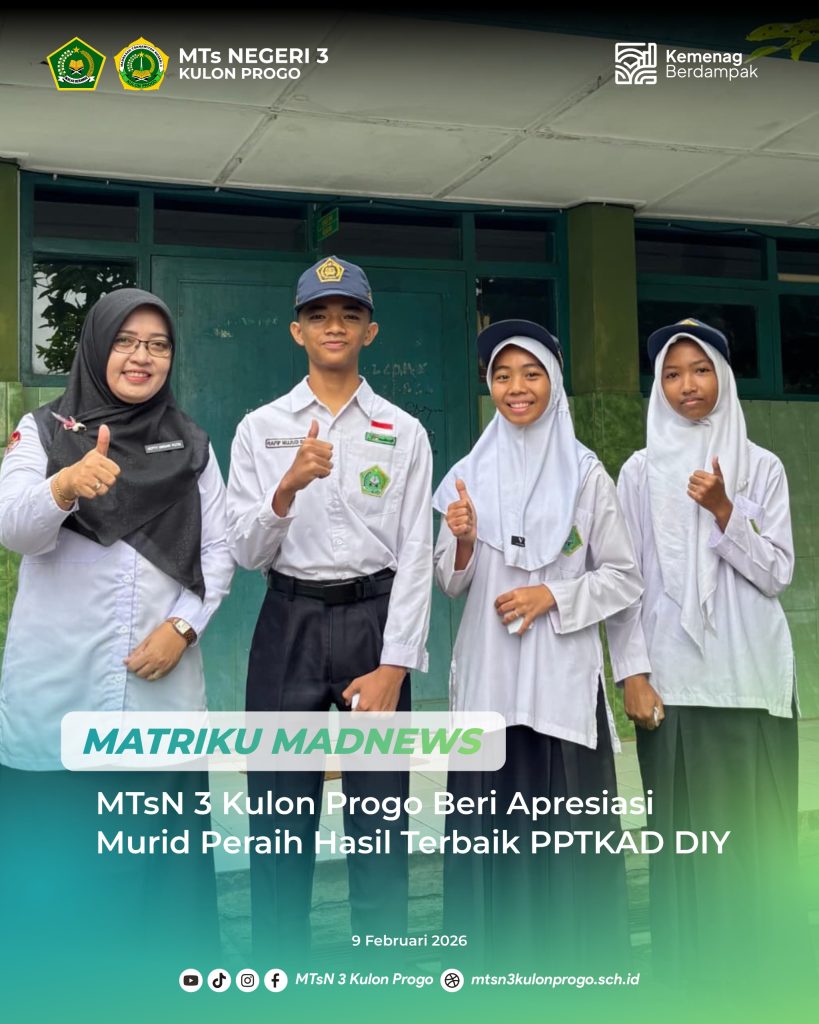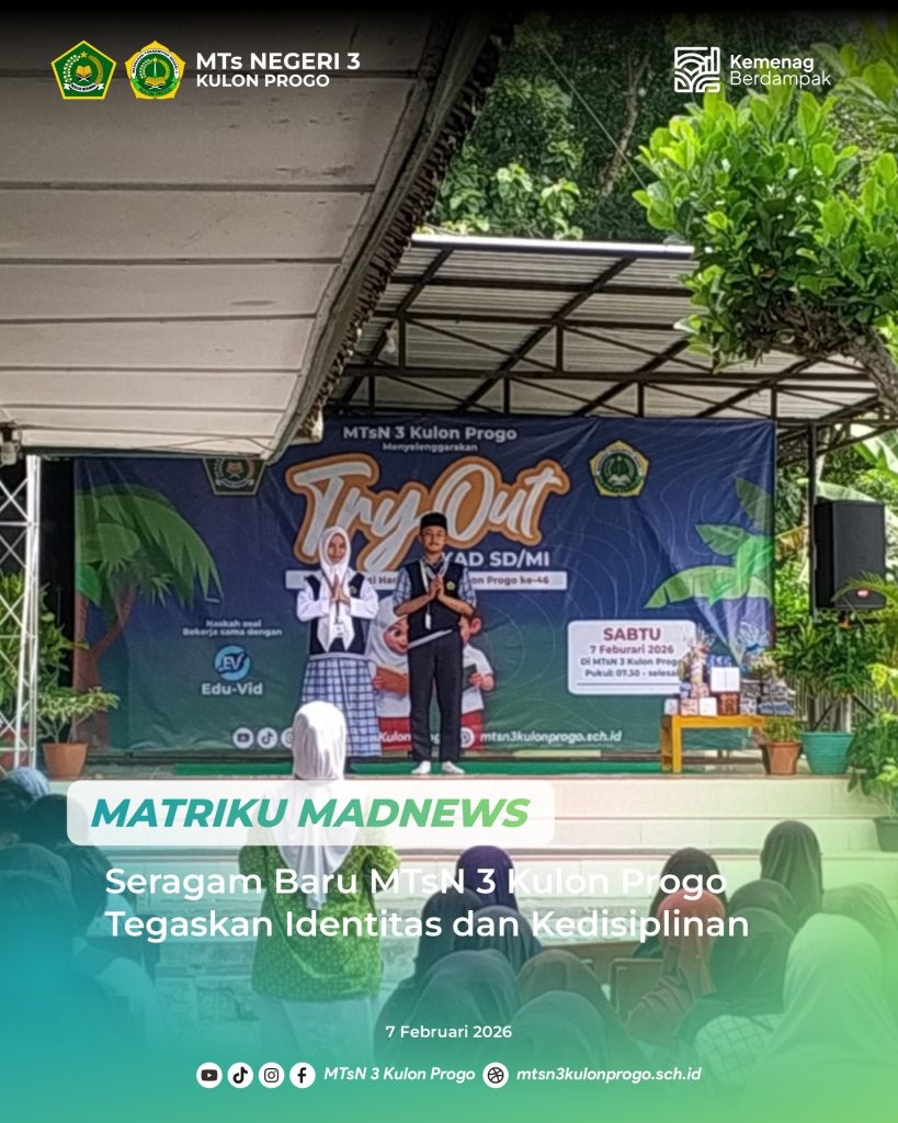 Kulon Progo (MTsN3KP) — MTsN 3 Kulon Progo melaksanakan pembiasaan mengenakan pakaian adat Jawa setiap Kamis Pon, salah satunya pada Kamis (05/02/2026). Kegiatan ini diikuti oleh seluruh peserta didik sebagai upaya menanamkan nilai cinta tanah air sekaligus melestarikan budaya daerah di lingkungan madrasah. Pembiasaan tersebut dilaksanakan selama kegiatan belajar mengajar berlangsung dan didampingi oleh guru,… Baca Selengkapnya: Pakaian Adat Jawa Tanamkan Cinta Tanah Air Di Madrasah - Dua Peserta Didik MTsN 3 Kulon Progo Ikuti Seleksi PORDA Atletik