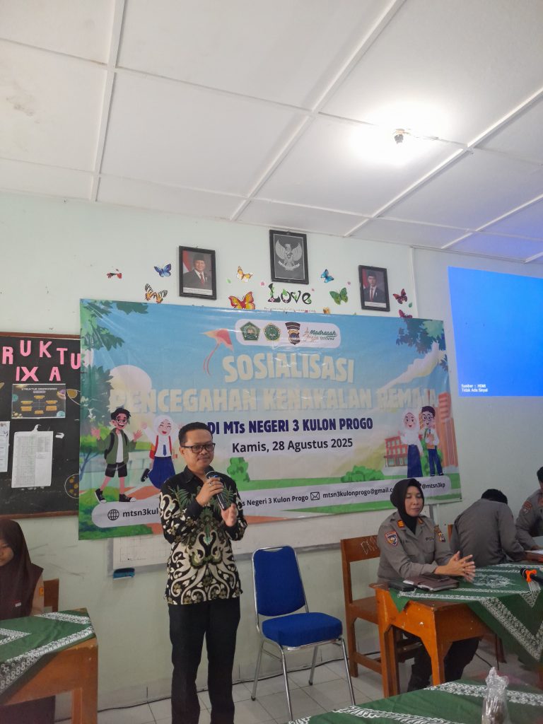 Kulon Progo (MTsN3KP) – Sosialisasi ini bertujuan untuk memberikan pemahaman kepada siswa tentang bahaya dan dampak dari kenakalan remaja serta mengajak mereka untuk berperan aktif dalam mencegah perilaku negatif. Hal ini merupakan wujud sinergritas antara pihak kepolisian dengan madrasah dengan melakukan sosialisasi secara bertahap. Kamis ( 28/8/2025).