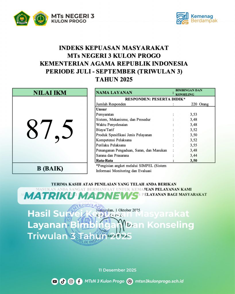 Kulon Progo (MTsN3KP) – MTsN 3 Kulon Progo merilis hasil Survei Kepuasan Masyarakat (SKM) untuk layanan Bimbingan dan Konseling pada periode Juli–September 2025 (Triwulan 3). Hasil survei tersebut diumumkan pada Kamis (11/12/2025) sebagai bentuk keterbukaan informasi publik dan upaya peningkatan mutu pelayanan madrasah.
