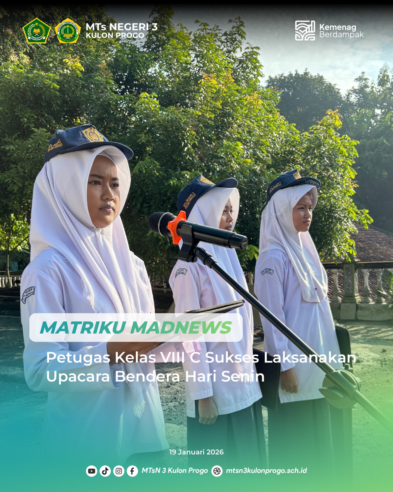 Kulon Progo (MTsN3KP) — Madrasah Tsanawiyah Negeri 3 Kulon Progo melaksanakan upacara bendera rutin pada Senin (19/01/2026) di halaman madrasah. Upacara tersebut diikuti oleh seluruh …
