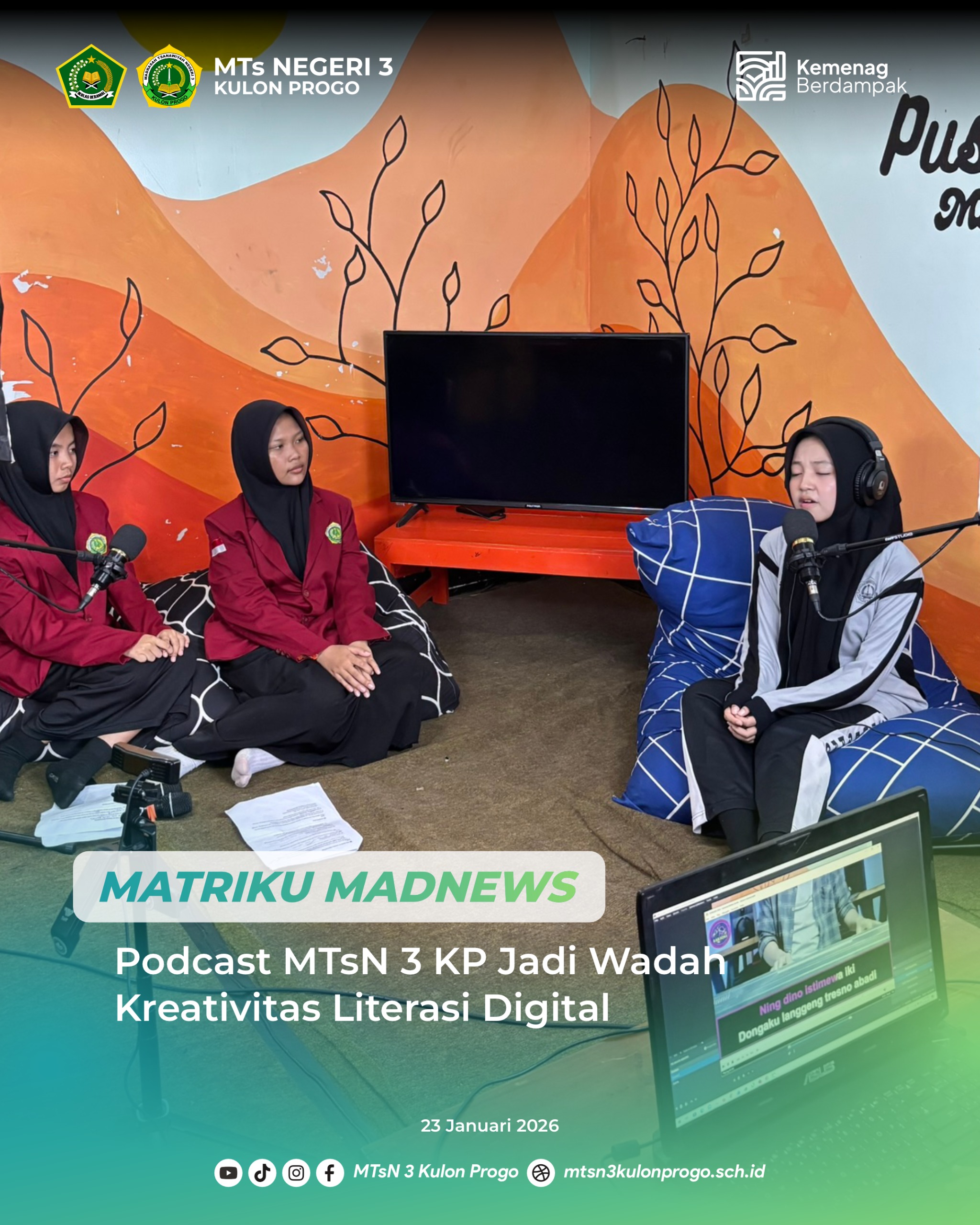 Kulon Progo (MTsN3KP) — MTsN 3 Kulon Progo melaksanakan kegiatan Podcast MTsN 3 KP pada Jumat (23/01/2026). Kegiatan ini menjadi wadah penguatan literasi digital serta sarana pengembangan kreativitas peserta didik dalam menyampaikan ide, gagasan, dan informasi secara positif melalui media digital.