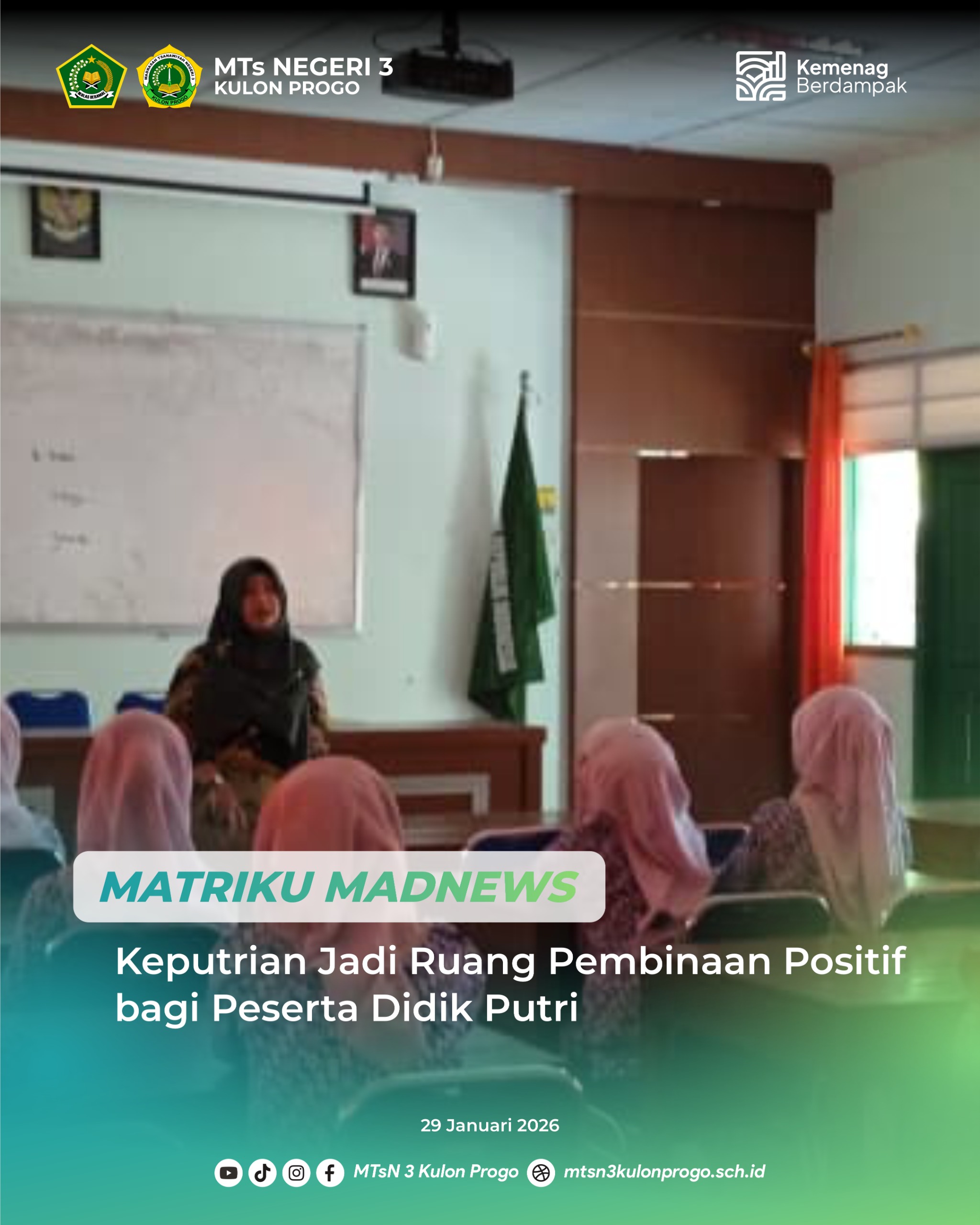 Kulon Progo (MTsN3KP) — MTsN 3 Kulon Progo melaksanakan kegiatan keputrian bagi peserta didik putri yang sedang berhalangan pada Rabu (29/01/2026). Kegiatan ini dilaksanakan di Laboratorium IPA MTsN 3 Kulon Progo sebagai bentuk pembinaan keagamaan dan penguatan karakter.