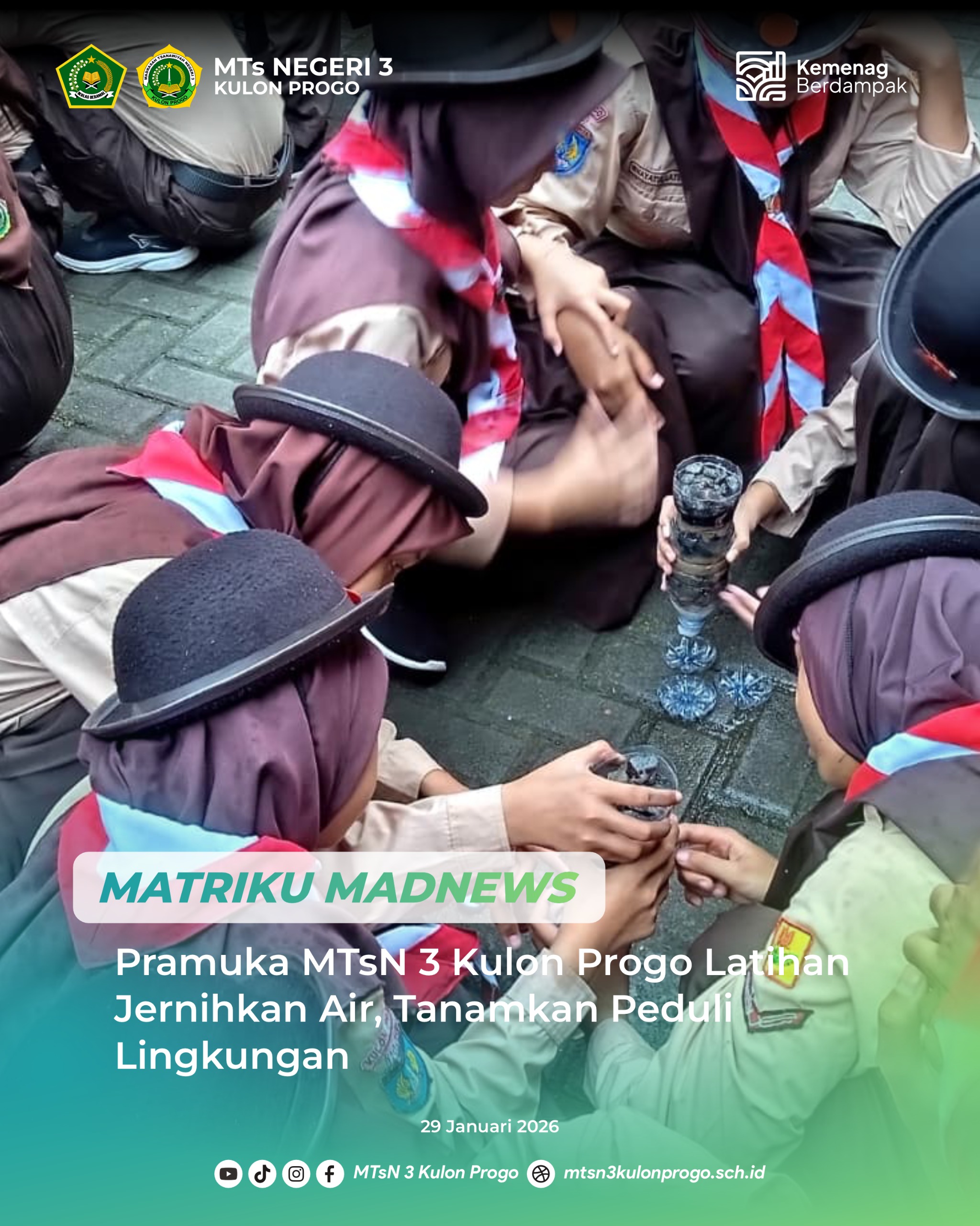 Kulon Progo (MTsN3KP) — Kegiatan Pramuka MTsN 3 Kulon Progo berupa latihan penjernihan air. Hal itu sebagai wujud kepedulian terhadap lingkungan. Latihan dilaksanakan di lapangan MTsN 3 Kulon Progo pada Kamis (29/1/2026). Kegiatan ini diikuti dengan antusias oleh peserta didik dari sudut pandang pengalaman langsung mereka di lapangan.