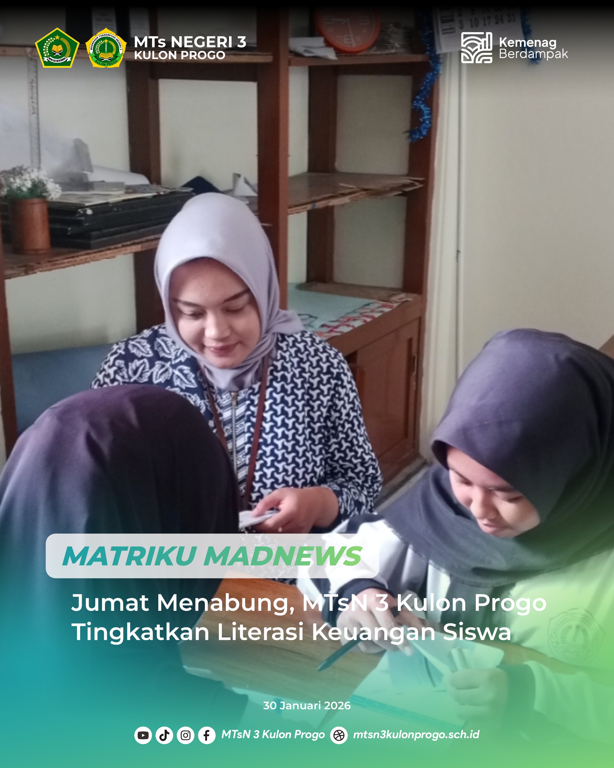 Kulon Progo (MTsN3KP) – MTsN 3 Kulon Progo melaksanakan program Jumat Menabung. Hal ini sebagai upaya meningkatkan literasi keuangan peserta didik. Kegiatan ini dilaksanakan secara rutin setiap Jumat dan diikuti oleh peserta didik dengan antusias. Jum’at Menabung juga sebagai bentuk pembiasaan mengelola keuangan sejak dini.