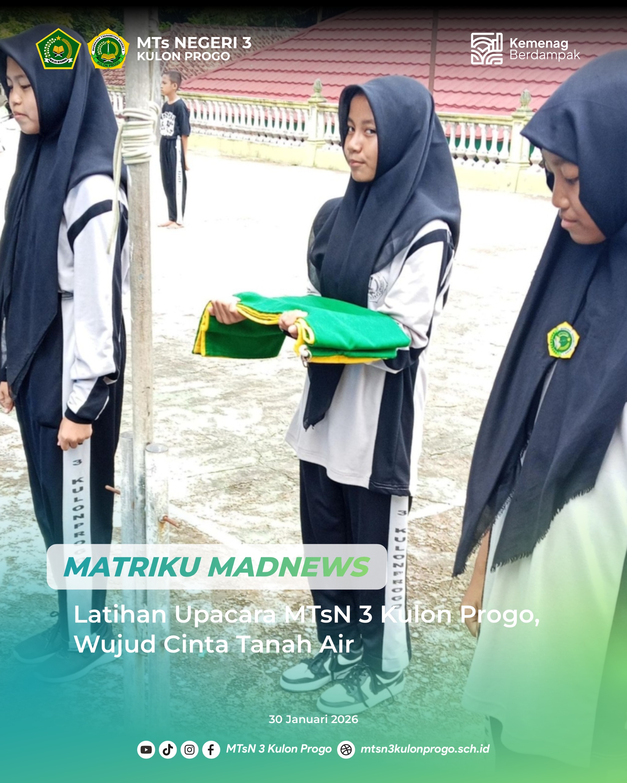 Kulon Progo (MTsN3KP) – MTsN 3 Kulon Progo melaksanakan kegiatan latihan upacara bendera, Jum’at (30/1/2026). Hal itu sebagai bentuk penanaman nilai cinta tanah air kepada peserta didik. Kegiatan ini dipersiapkan untuk upacara Senin (2/2/2026) mendatang dengan petugas dari kelas VII A dan dilaksanakan di lapangan madrasah.