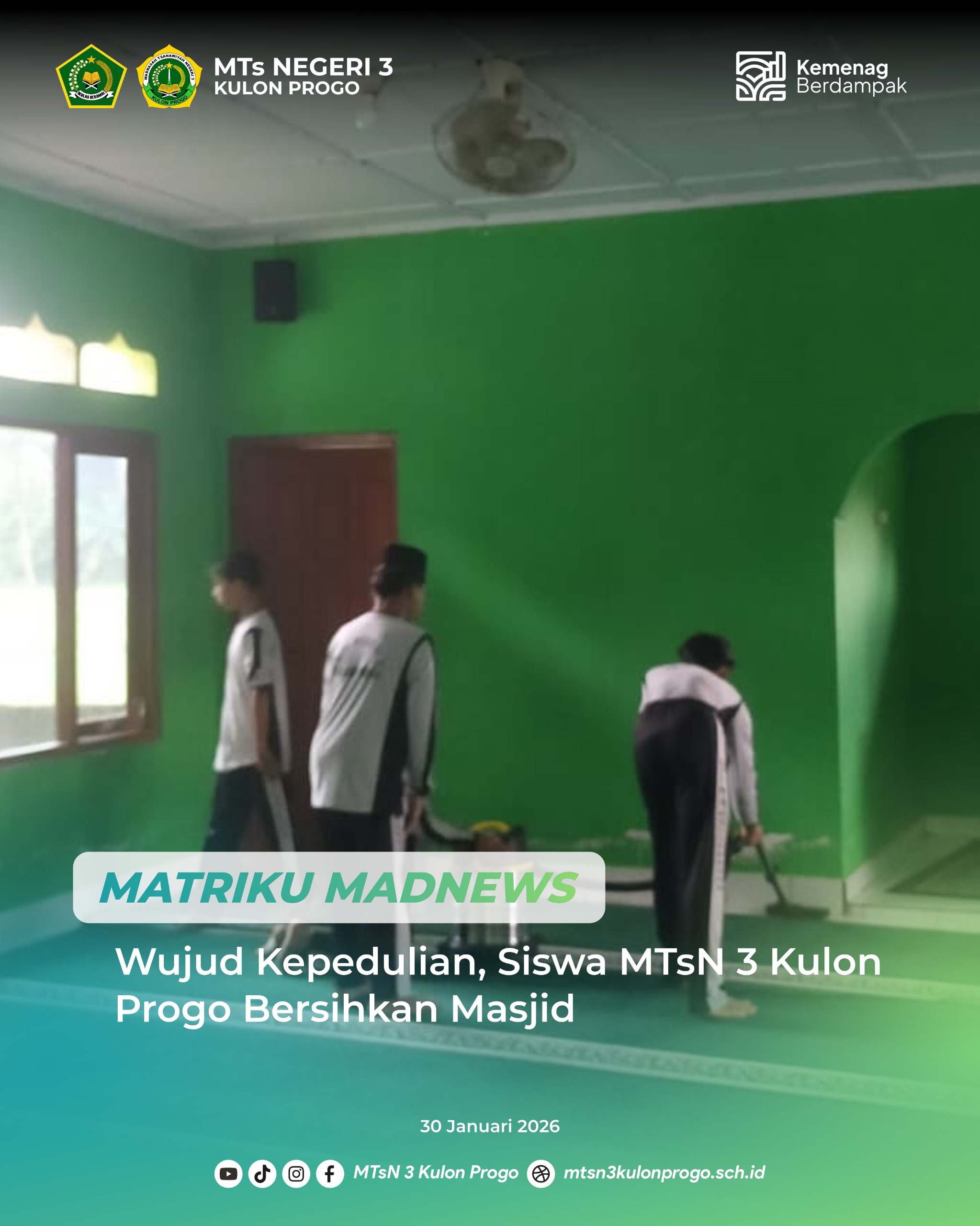 Kulon Progo (MTsN3KP) — MTsN 3 Kulon Progo melaksanakan kegiatan kerja bakti di Masjid Al Hidayah, Bandung, Donomulyo. Hal itu sebagai bentuk peran serta madrasah kepada masyarakat sekitar. Kegiatan ini dilaksanakan pada Jum’at (30/1/2026) dengan melibatkan peserta didik dan guru pendamping.
