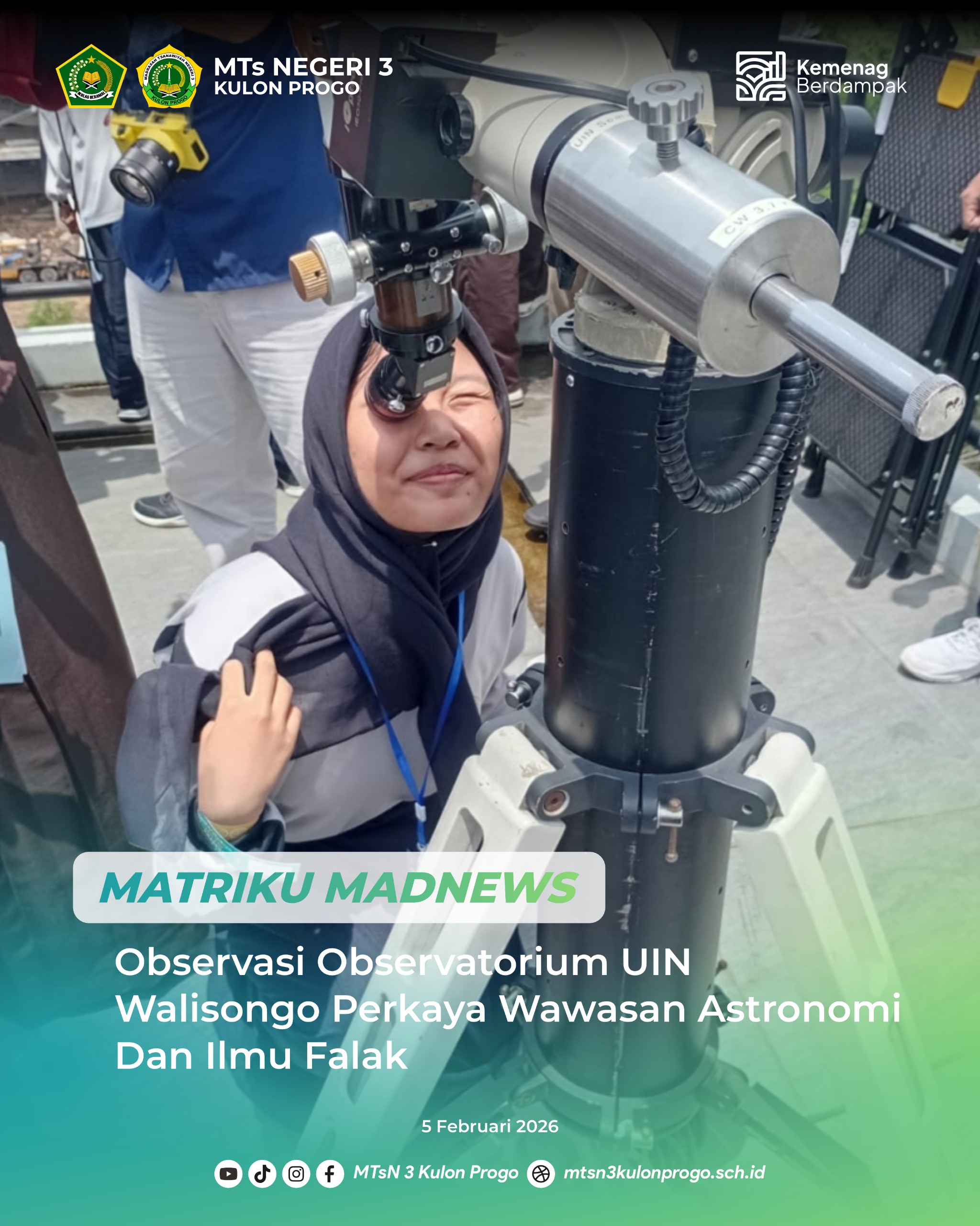 Kulon Progo (MTsN3KP) — MTsN 3 Kulon Progo melaksanakan kegiatan observasi pembelajaran di Observatorium UIN Walisongo Semarang pada Kamis (05/02/2026). Kegiatan ini bertujuan memperluas wawasan peserta didik mengenai ilmu astronomi dan ilmu falak melalui pembelajaran langsung di luar kelas.