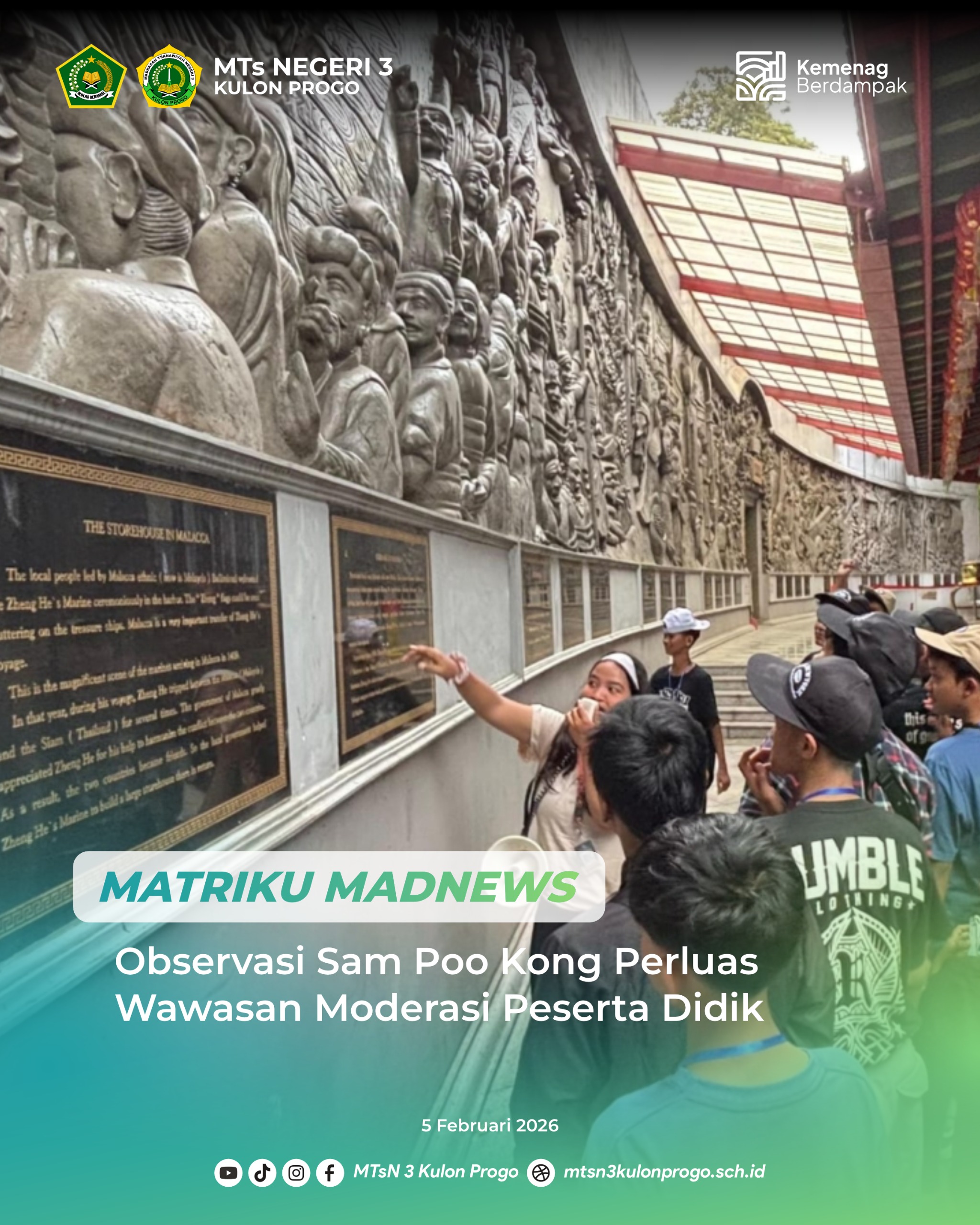Kulon Progo (MTsN3KP) — Peserta didik kelas VIII MTsN 3 Kulon Progo melaksanakan kegiatan observasi pembelajaran di kawasan wisata religi dan budaya Sam Poo Kong, Semarang, pada Kamis (05/02/2026). Kegiatan ini bertujuan memperluas wawasan peserta didik tentang sejarah, budaya, serta nilai toleransi dan moderasi beragama melalui pembelajaran langsung di lapangan.