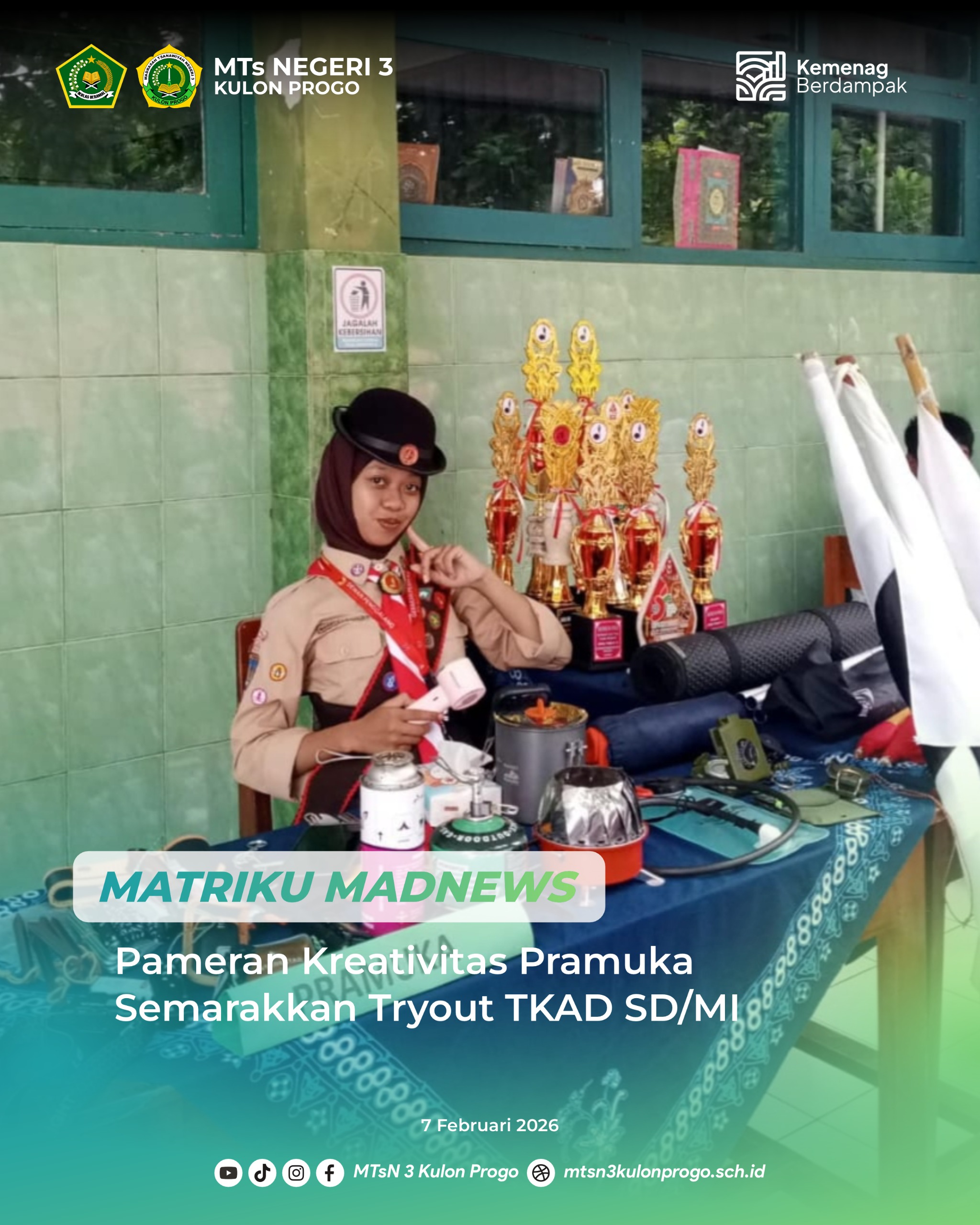Kulon Progo (MTsN3KP) — MTsN 3 Kulon Progo menyelenggarakan pameran kreativitas kepramukaan dalam rangka tryout TKAD SD/MI pada Sabtu (07/02/2026). Pameran digelar di area depan ruang kelas dan menjadi bagian dari rangkaian penyambutan peserta tryout yang berkunjung ke madrasah.