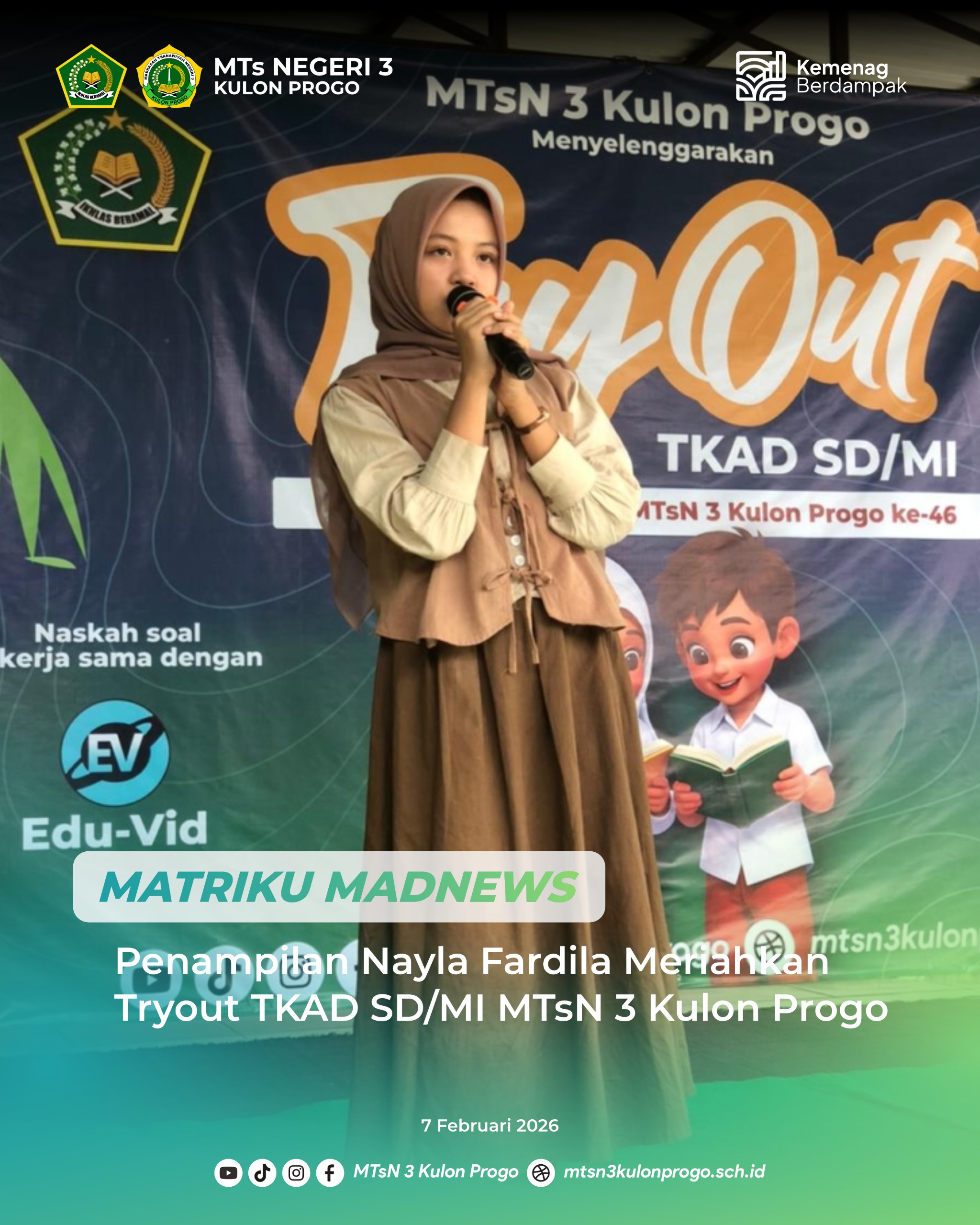Kulon Progo (MTsN3KP) — Penampilan seni musik turut mewarnai pelaksanaan tryout TKAD SD/MI yang diselenggarakan MTsN 3 Kulon Progo pada Sabtu (07/02/2026). Salah satu penampilan yang berhasil menarik perhatian datang dari Nayla Fardila, peserta didik MTsN 3 Kulon Progo yang berprestasi di bidang seni musik, khususnya bernyanyi.