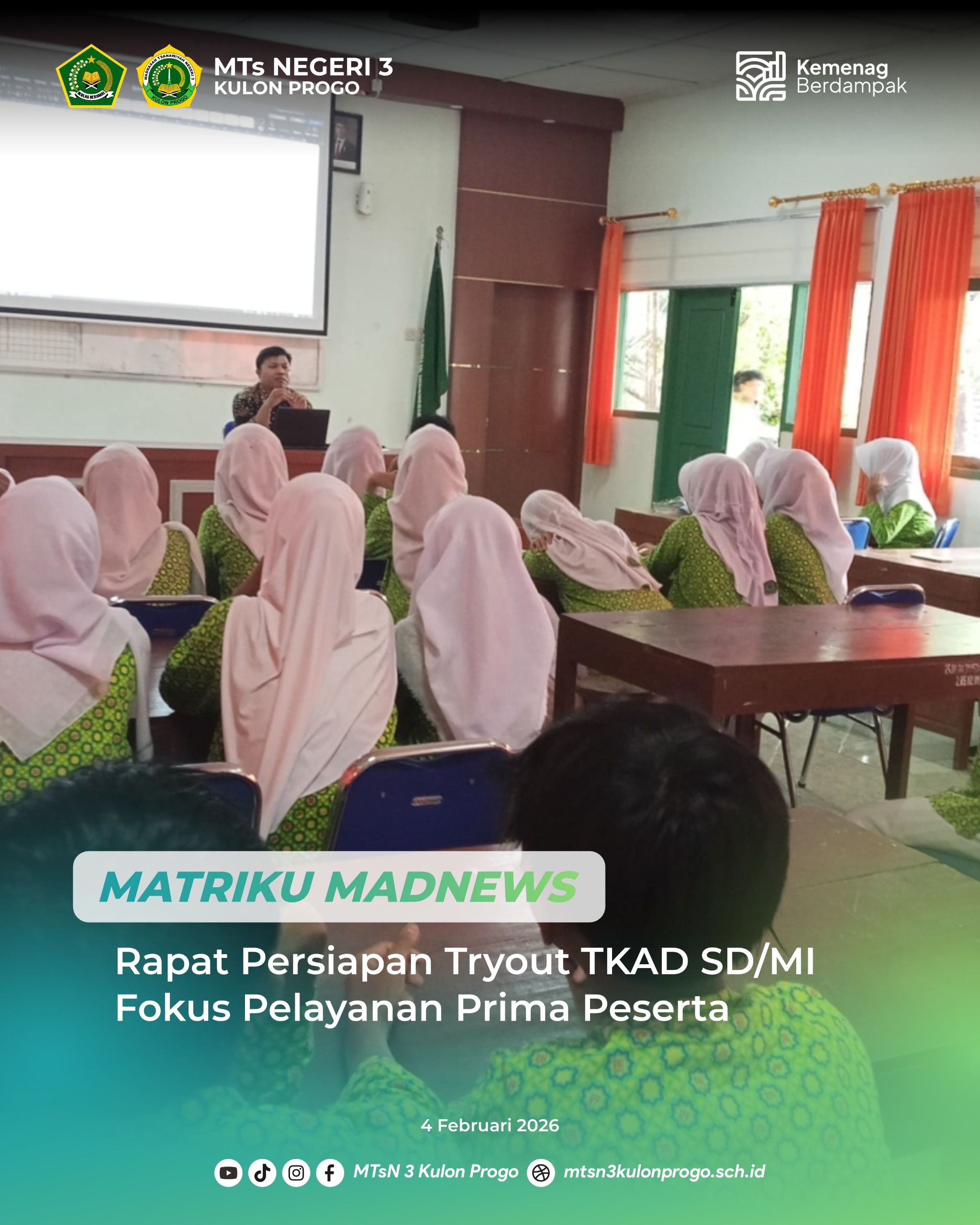 Kulon Progo (MTsN3KP) — MTsN 3 Kulon Progo menggelar rapat persiapan pelaksanaan tryout TKAD SD/MI yang akan dilaksanakan pada Jumat (07/02/2026). Rapat ini melibatkan OSIM Nayaka Bhakti dan Dewan Penggalang, serta dilaksanakan pada Rabu (04/02/2026) bertempat di Laboratorium IPA.