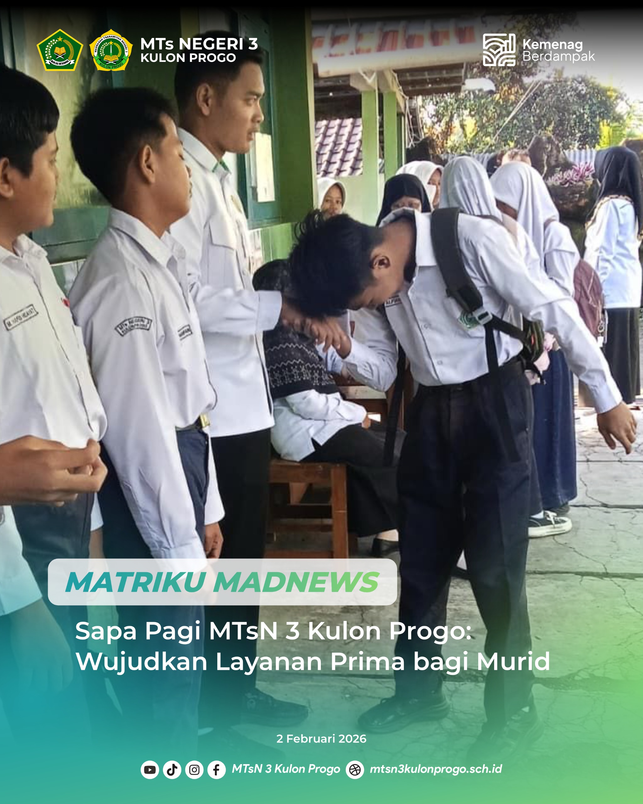Kulon Progo (MTsN3KP) – Madrasah melaksanakan kegiatan sapa pagi sebagai bentuk pelayanan prima dalam menyambut murid pada Senin (2/2/2026). Kegiatan ini berlangsung di area belakang …