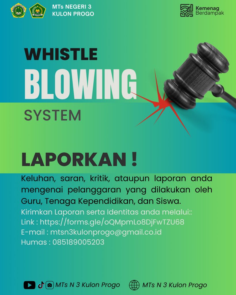 WBS adalah mekanisme pelaporan yang dirancang untuk memfasilitasi siswa, guru, tenaga kependidikan, serta orang tua atau wali siswa dalam menyampaikan informasi terkait dugaan pelanggaran atau tindakan yang tidak sesuai dengan peraturan dan nilai-nilai etika di lingkungan MTsN 3 Kulon Progo.